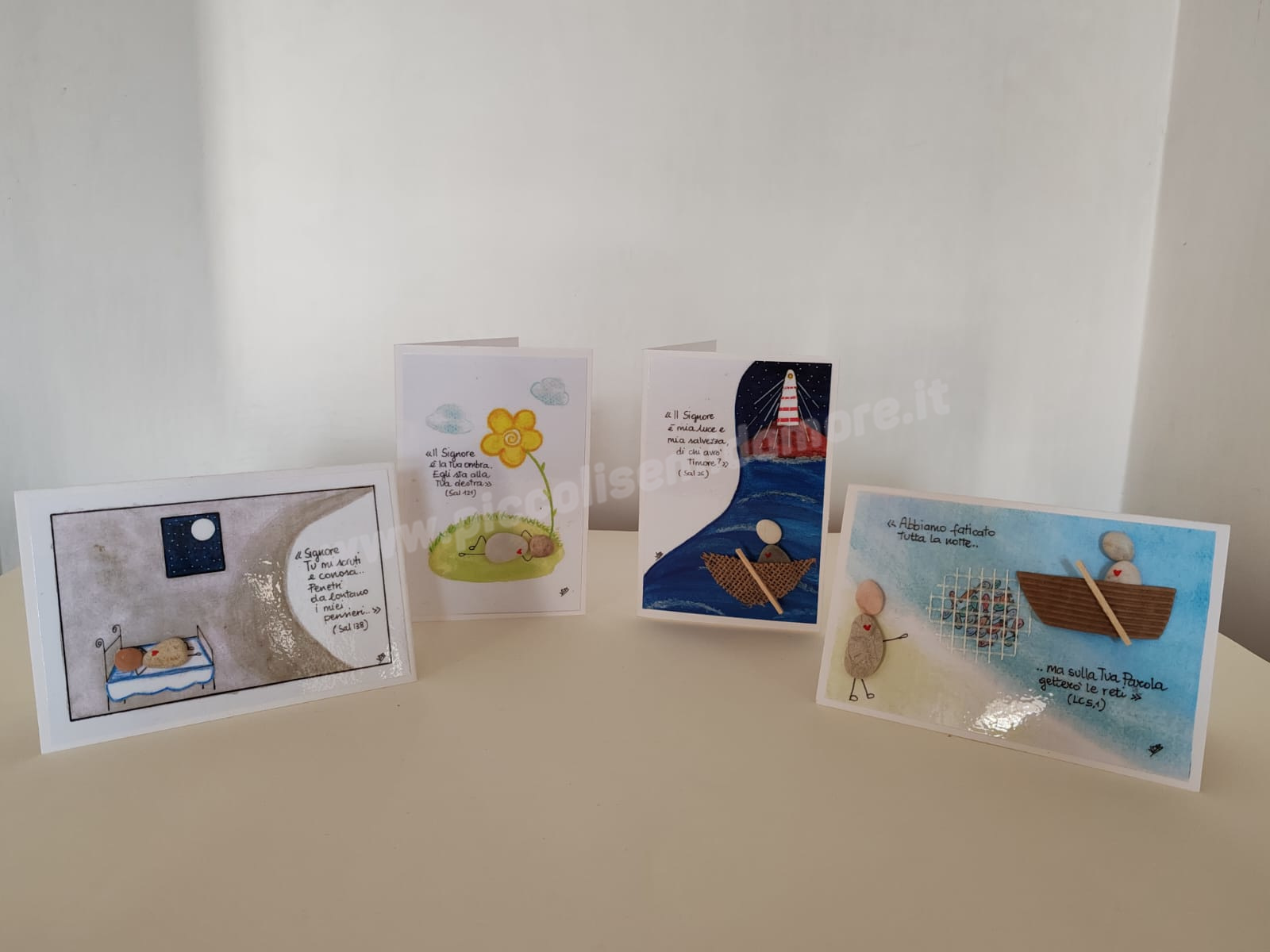 A differenza dei biglietti-quadretti si presentano senza la cornice esterna, come “classici” biglietti in cartoncino riprodotti diglitalmente, sempre con l’aggiunta dei sassi come elemento costitutivo.