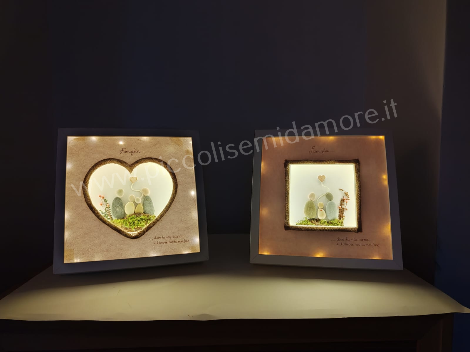 I quadri illuminati e le lampade, ultimi nati della linea “Anche i sassi parlano” sono pensati come oggetti speciali per festeggiare o ricordare momenti significativi della propria vita o di quella dei nostri cari (matrimoni, anniversari, sacramenti) o come complementi d’arredo unici da acquistare per la propria casa o da regalare.