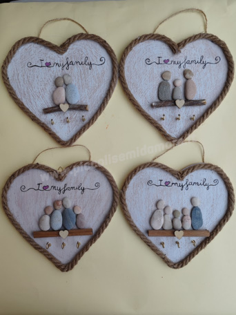 1. Appendichiavi da parete sul tema “Family”, personalizzabili in base al numero dei componenti della famiglia e con l’eventuale aggiunta dei nomi o animali domestici. Il prezzo varia a seconda del numero dei sassi e delle personalizzazioni e va dai 18 ai 25€.