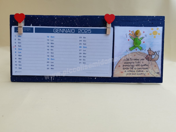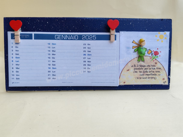 1. Calendari da scrivania in legno, sul tema “Piccolo Principe” riutilizzabili di anno in anno cambiando la parte cartacea. Il prezzo è di 20 €.