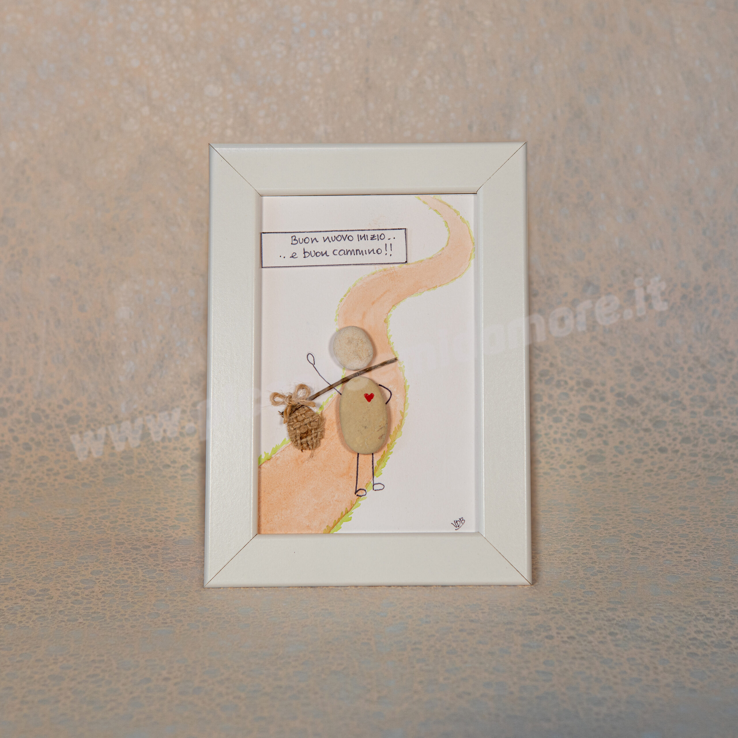 Formato standard 10×15, cornice bianca (materiale plastica). Soggetto su cartoncino acquarellabile gr 250 con possibilità di scrittura al suo interno. Rivestimento esterno del biglietto in plexiglass. Eventuali formati più grandi da concordare con costo aggiuntivo. Per la particolarità ed unicità dei sassi utilizzati, ogni pezzo differisce in piccoli particolari dagli altri e dal prototipo mostrato in foto. Questo rende unico e irripetibile ogni articolo.