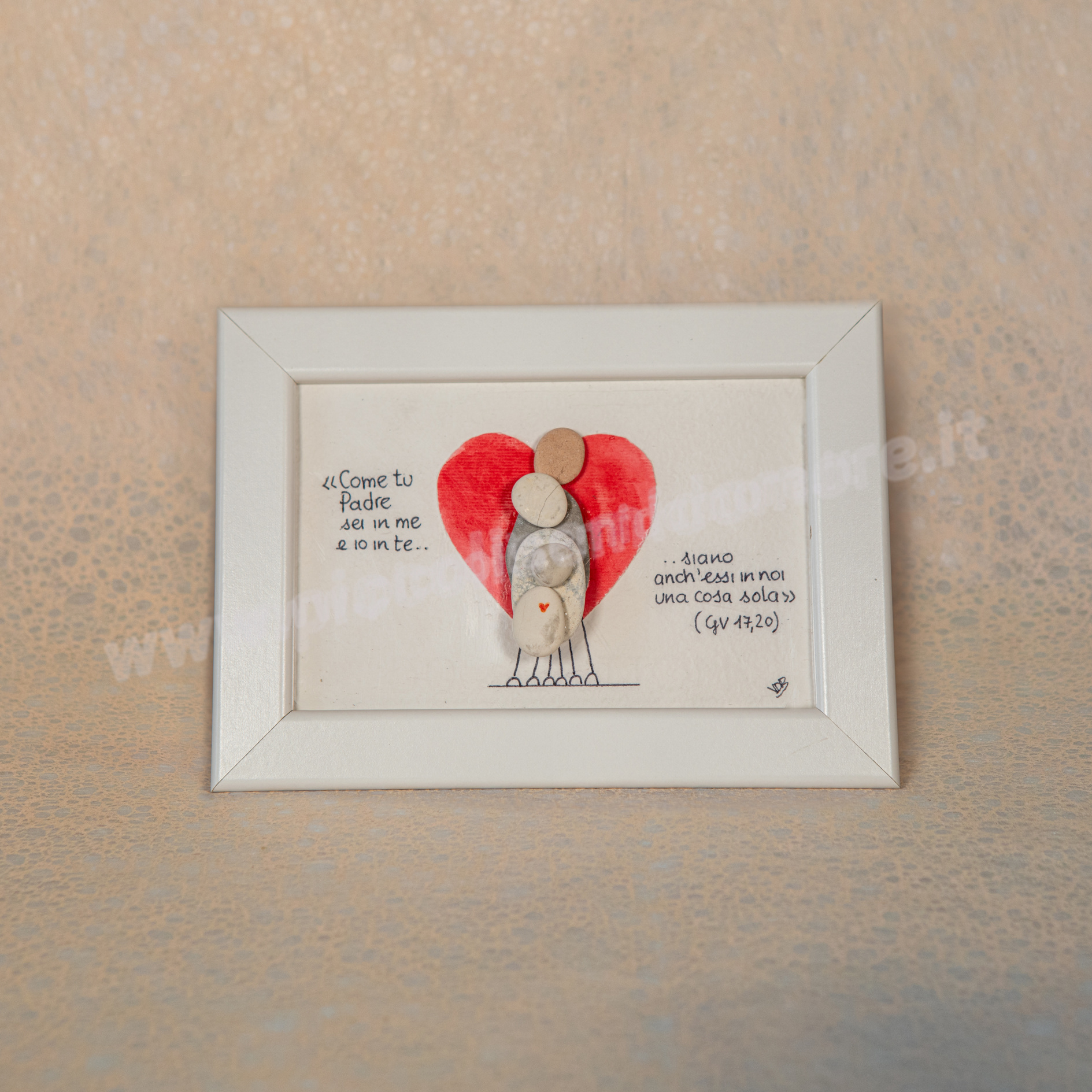 Formato standard 10×15, cornice bianca (materiale plastica). Soggetto su cartoncino acquarellabile gr 250 con possibilità di scrittura al suo interno. Rivestimento esterno del biglietto in plexiglass. Eventuali formati più grandi da concordare con costo aggiuntivo. Per la particolarità ed unicità dei sassi utilizzati, ogni pezzo differisce in piccoli particolari dagli altri e dal prototipo mostrato in foto. Questo rende unico e irripetibile ogni articolo.