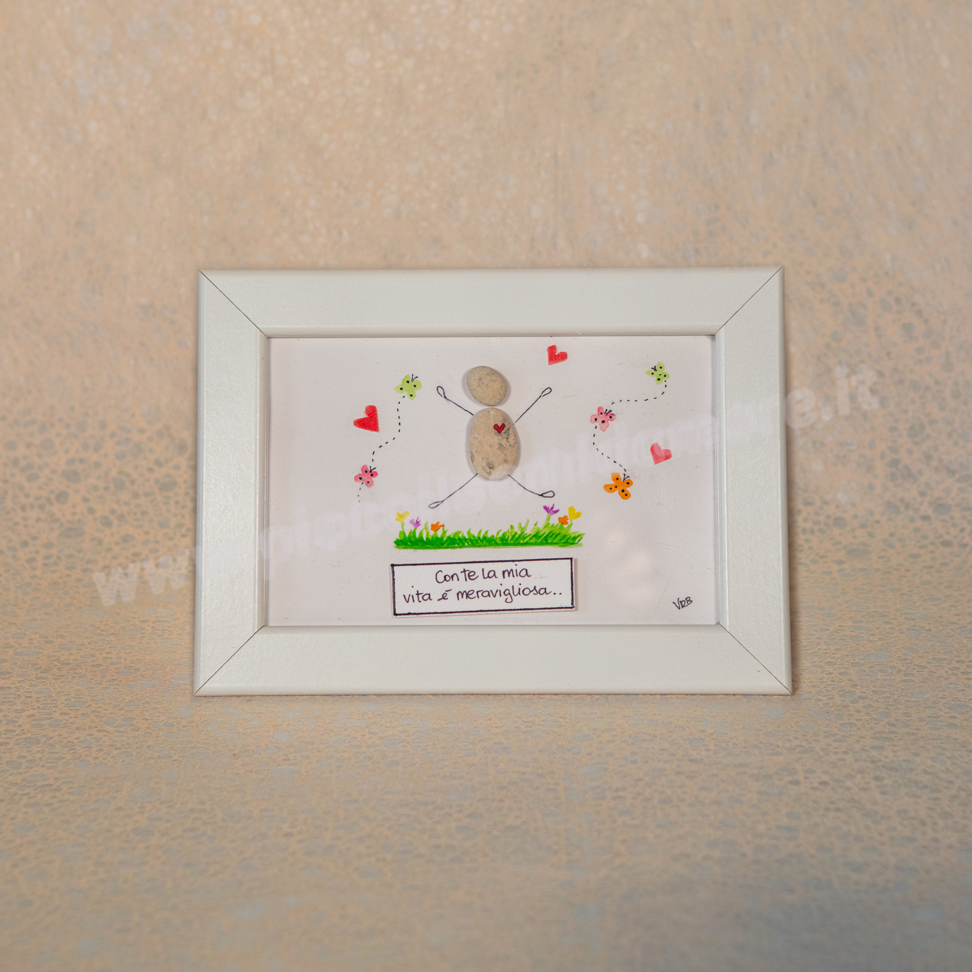 Formato standard 10×15, cornice bianca (materiale plastica). Soggetto su cartoncino acquarellabile gr 250 con possibilità di scrittura al suo interno. Rivestimento esterno del biglietto in plexiglass. Eventuali formati più grandi da concordare con costo aggiuntivo. Per la particolarità ed unicità dei sassi utilizzati, ogni pezzo differisce in piccoli particolari dagli altri e dal prototipo mostrato in foto. Questo rende unico e irripetibile ogni articolo.