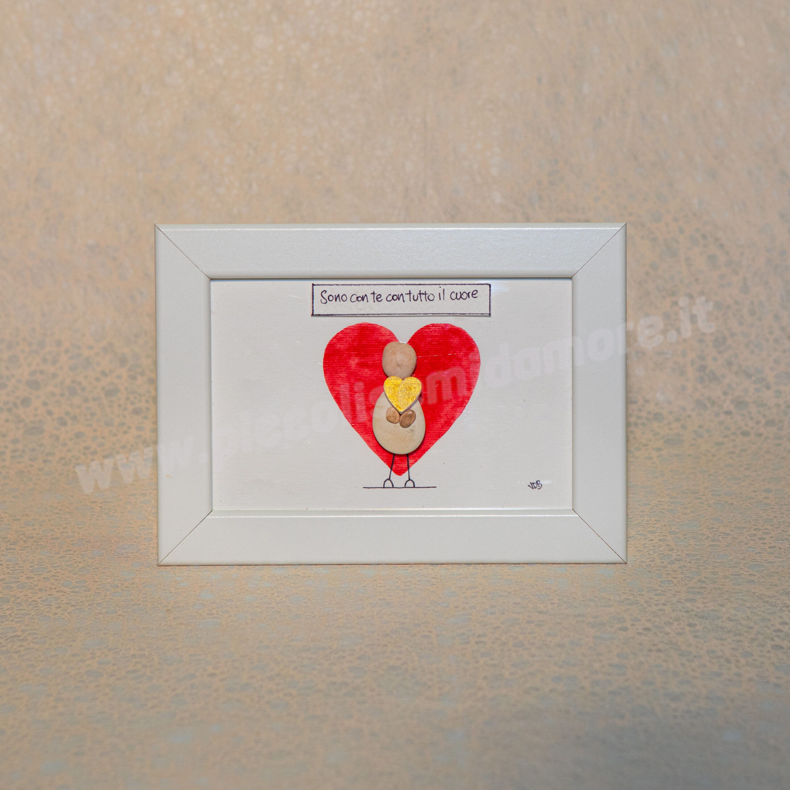 Formato standard 10×15, cornice bianca (materiale plastica). Soggetto su cartoncino acquarellabile gr 250 con possibilità di scrittura al suo interno. Rivestimento esterno del biglietto in plexiglass. Eventuali formati più grandi da concordare con costo aggiuntivo. Per la particolarità ed unicità dei sassi utilizzati, ogni pezzo differisce in piccoli particolari dagli altri e dal prototipo mostrato in foto. Questo rende unico e irripetibile ogni articolo.