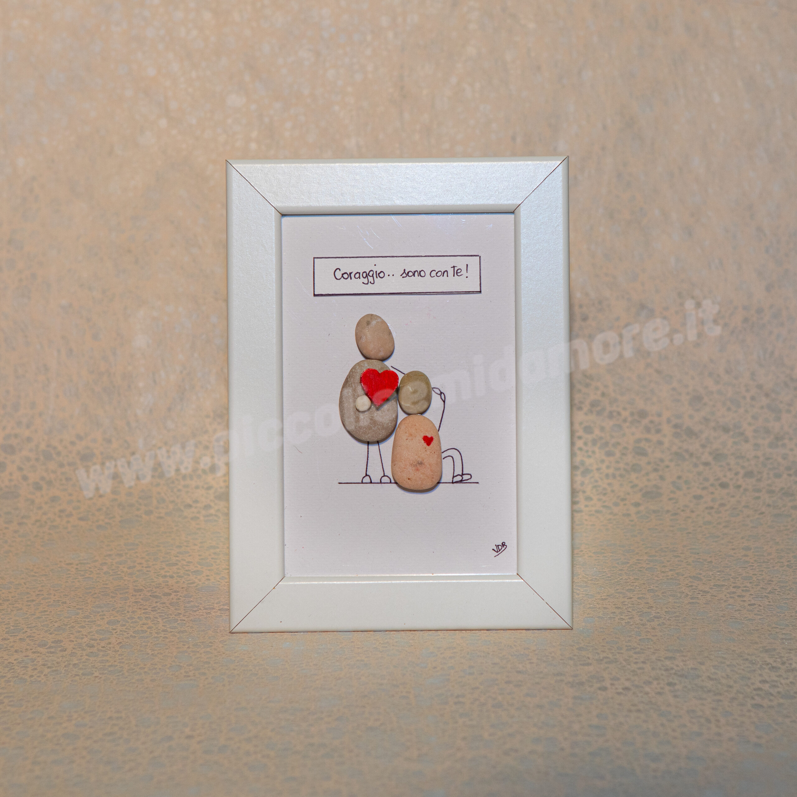 Formato standard 10×15, cornice bianca (materiale plastica). Soggetto su cartoncino acquarellabile gr 250 con possibilità di scrittura al suo interno. Rivestimento esterno del biglietto in plexiglass. Eventuali formati più grandi da concordare con costo aggiuntivo. Per la particolarità ed unicità dei sassi utilizzati, ogni pezzo differisce in piccoli particolari dagli altri e dal prototipo mostrato in foto. Questo rende unico e irripetibile ogni articolo.