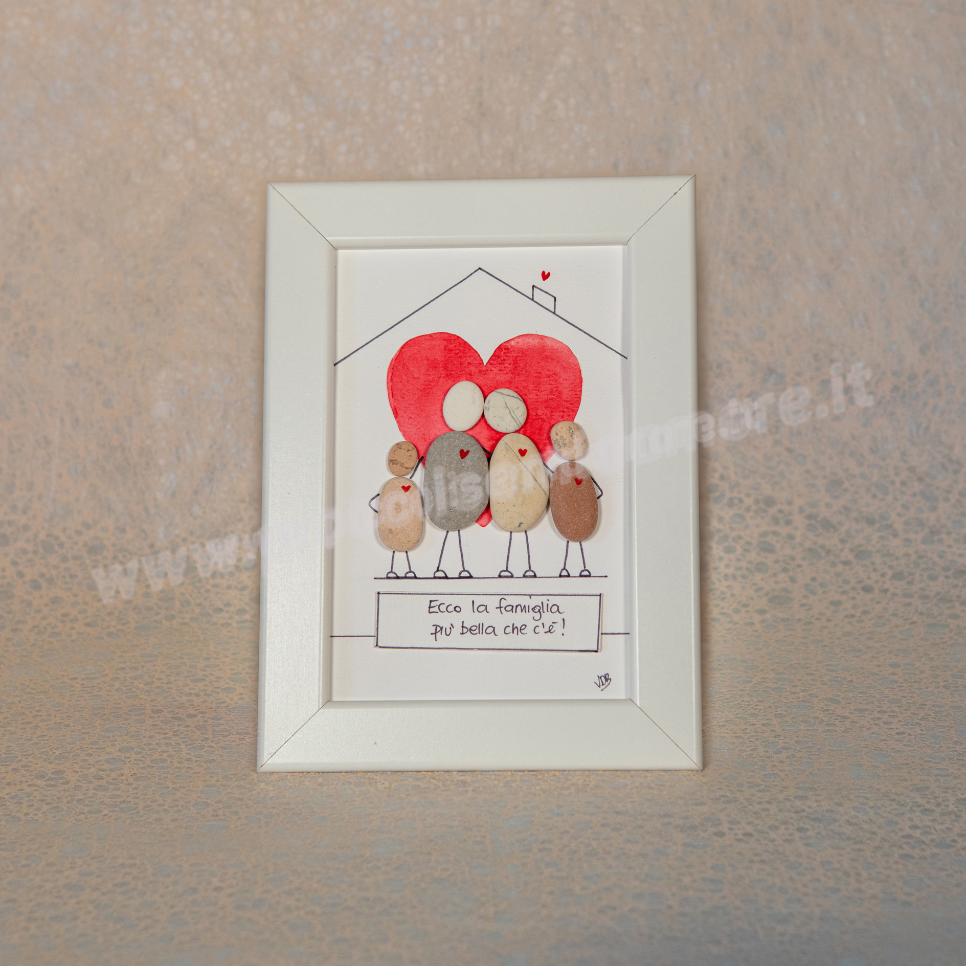 Formato standard 10×15, cornice bianca (materiale plastica). Soggetto su cartoncino acquarellabile gr 250 con possibilità di scrittura al suo interno. Rivestimento esterno del biglietto in plexiglass. Eventuali formati più grandi da concordare con costo aggiuntivo. Per la particolarità ed unicità dei sassi utilizzati, ogni pezzo differisce in piccoli particolari dagli altri e dal prototipo mostrato in foto. Questo rende unico e irripetibile ogni articolo.