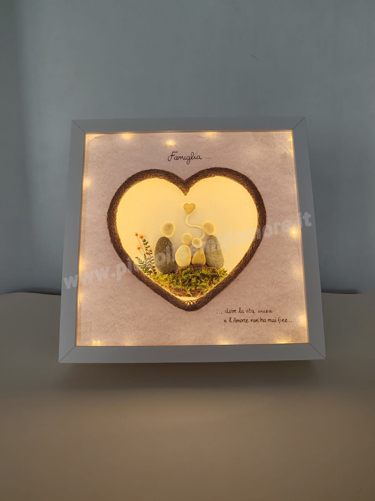 I quadri illuminati e le lampade, ultimi nati della linea “Anche i sassi parlano” sono pensati come oggetti speciali per festeggiare o ricordare momenti significativi della propria vita o di quella dei nostri cari (matrimoni, anniversari, sacramenti) o come complementi d’arredo unici da acquistare per la propria casa o da regalare.