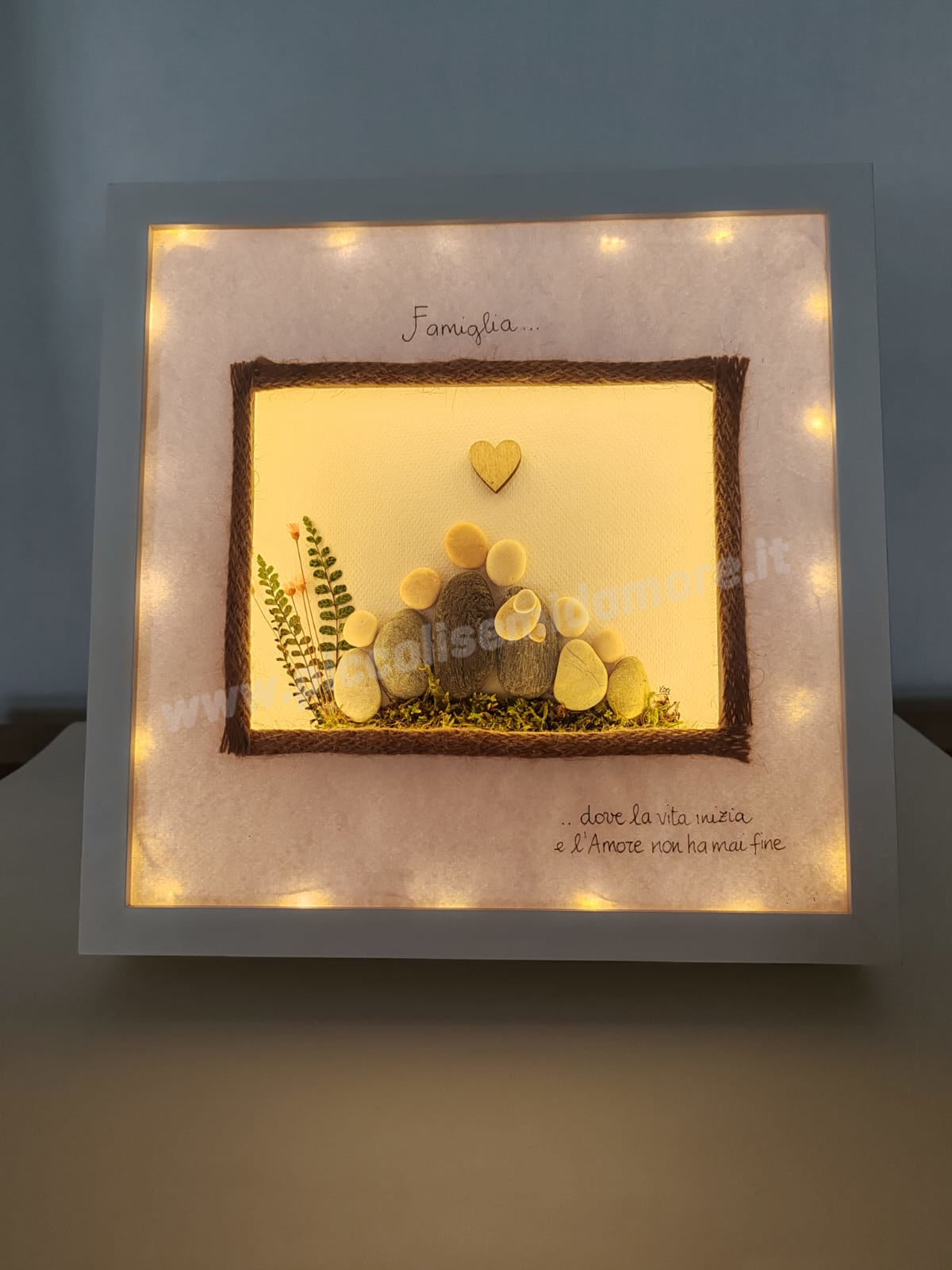 I quadri illuminati e le lampade, ultimi nati della linea “Anche i sassi parlano” sono pensati come oggetti speciali per festeggiare o ricordare momenti significativi della propria vita o di quella dei nostri cari (matrimoni, anniversari, sacramenti) o come complementi d’arredo unici da acquistare per la propria casa o da regalare.