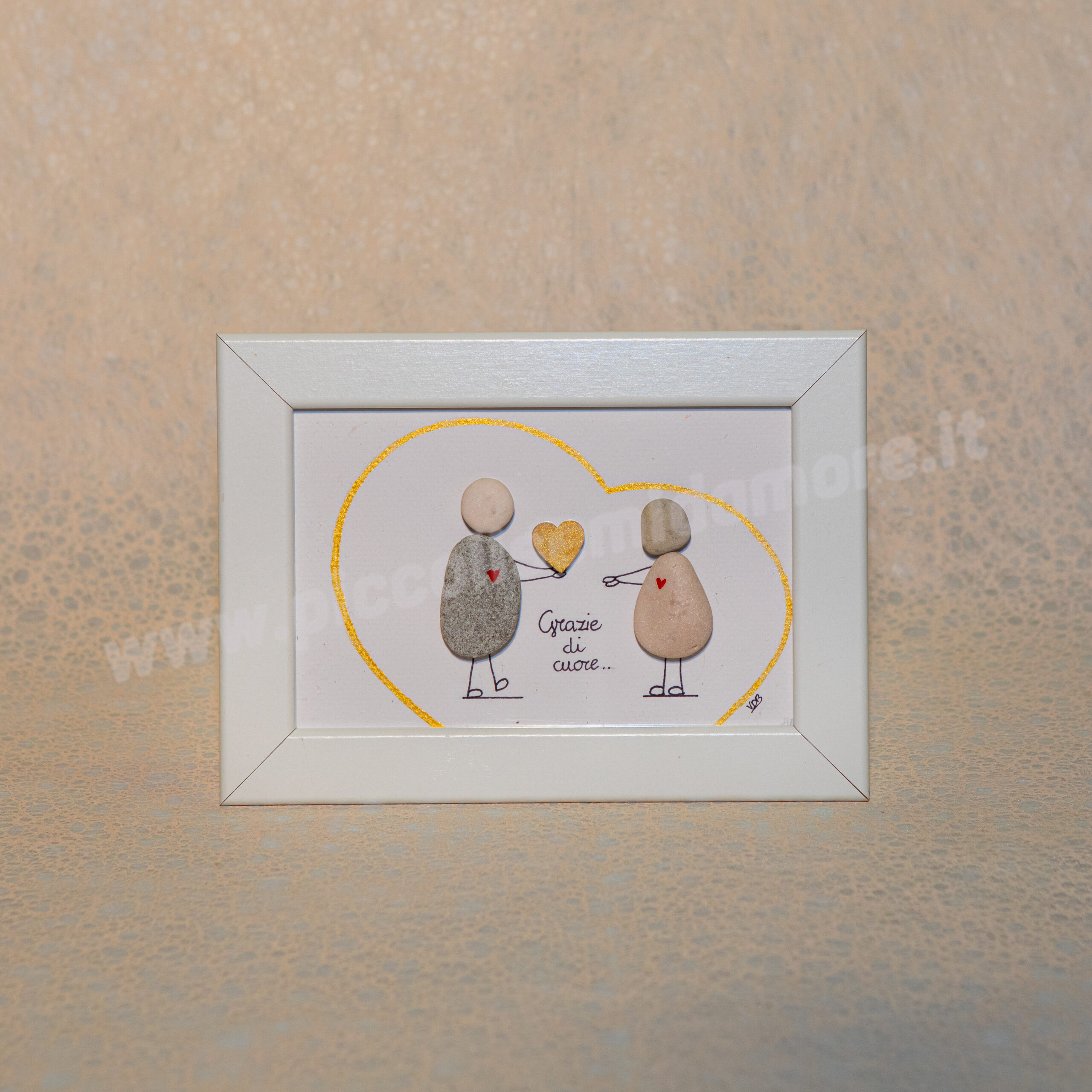 Formato standard 10×15, cornice bianca (materiale plastica). Soggetto su cartoncino acquarellabile gr 250 con possibilità di scrittura al suo interno. Rivestimento esterno del biglietto in plexiglass. Eventuali formati più grandi da concordare con costo aggiuntivo. Per la particolarità ed unicità dei sassi utilizzati, ogni pezzo differisce in piccoli particolari dagli altri e dal prototipo mostrato in foto. Questo rende unico e irripetibile ogni articolo.