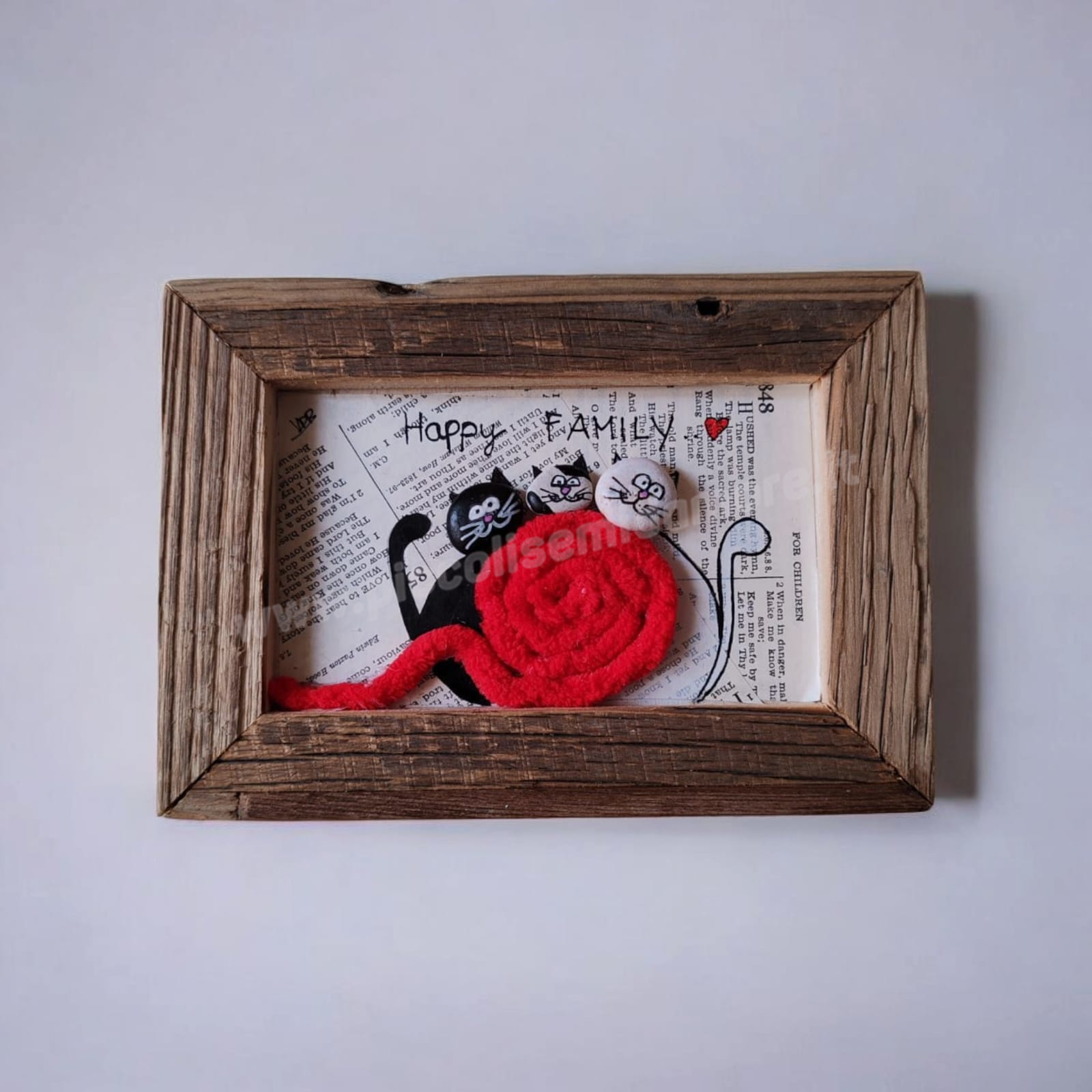 Il formato standard è di dimensioni 10×15 con cornice di legno, senza plexiglass, con la particolarità di avere come sfondo pezzi di giornale o di libro da reciclo.