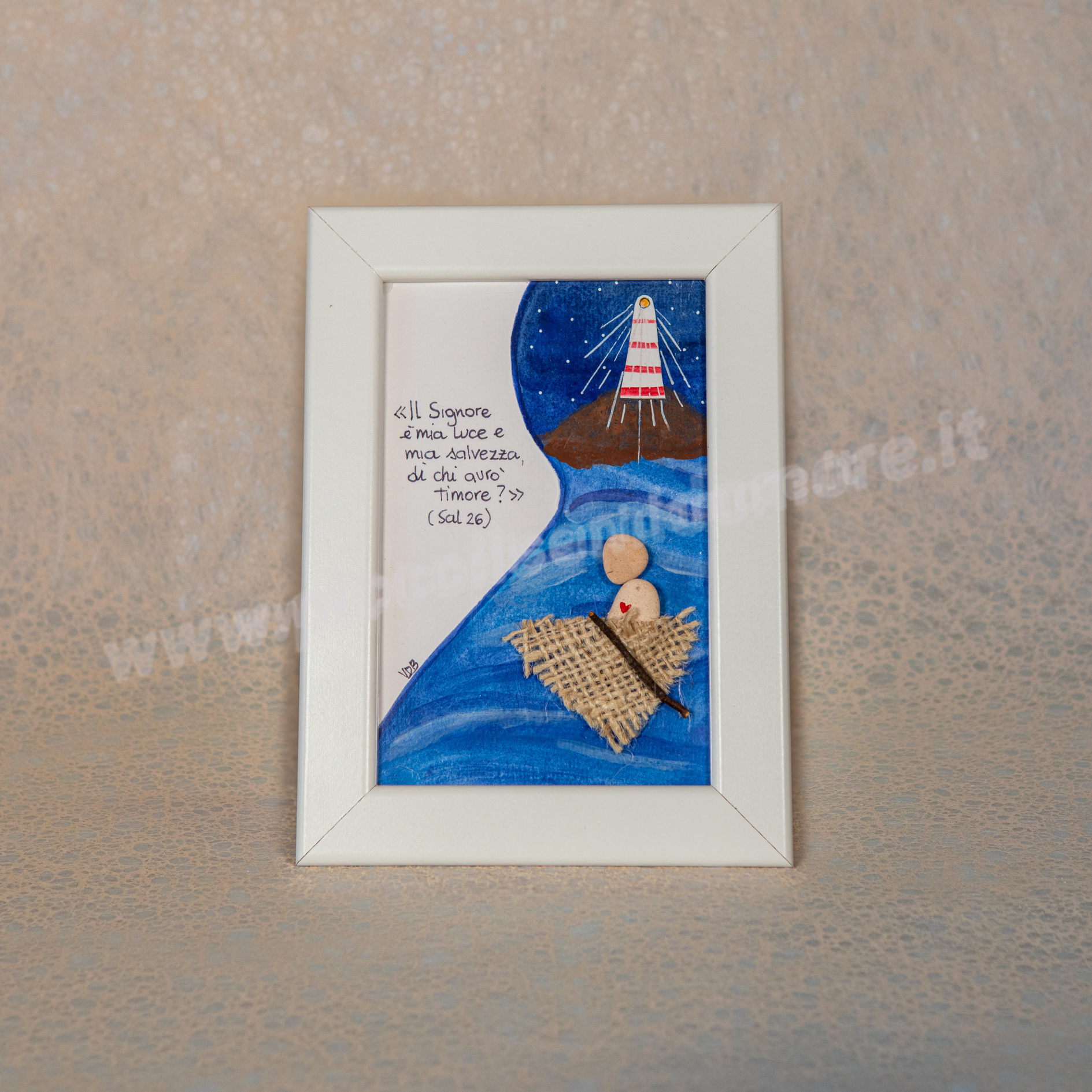 Formato standard 10×15, cornice bianca (materiale plastica). Soggetto su cartoncino acquarellabile gr 250 con possibilità di scrittura al suo interno. Rivestimento esterno del biglietto in plexiglass. Eventuali formati più grandi da concordare con costo aggiuntivo. Per la particolarità ed unicità dei sassi utilizzati, ogni pezzo differisce in piccoli particolari dagli altri e dal prototipo mostrato in foto. Questo rende unico e irripetibile ogni articolo.