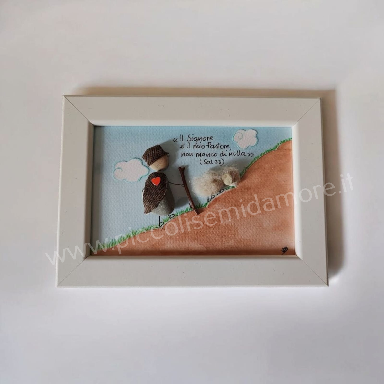 Formato standard 10×15, cornice bianca (materiale plastica). Soggetto su cartoncino acquarellabile gr 250 con possibilità di scrittura al suo interno. Rivestimento esterno del biglietto in plexiglass. Eventuali formati più grandi da concordare con costo aggiuntivo. Per la particolarità ed unicità dei sassi utilizzati, ogni pezzo differisce in piccoli particolari dagli altri e dal prototipo mostrato in foto. Questo rende unico e irripetibile ogni articolo.
