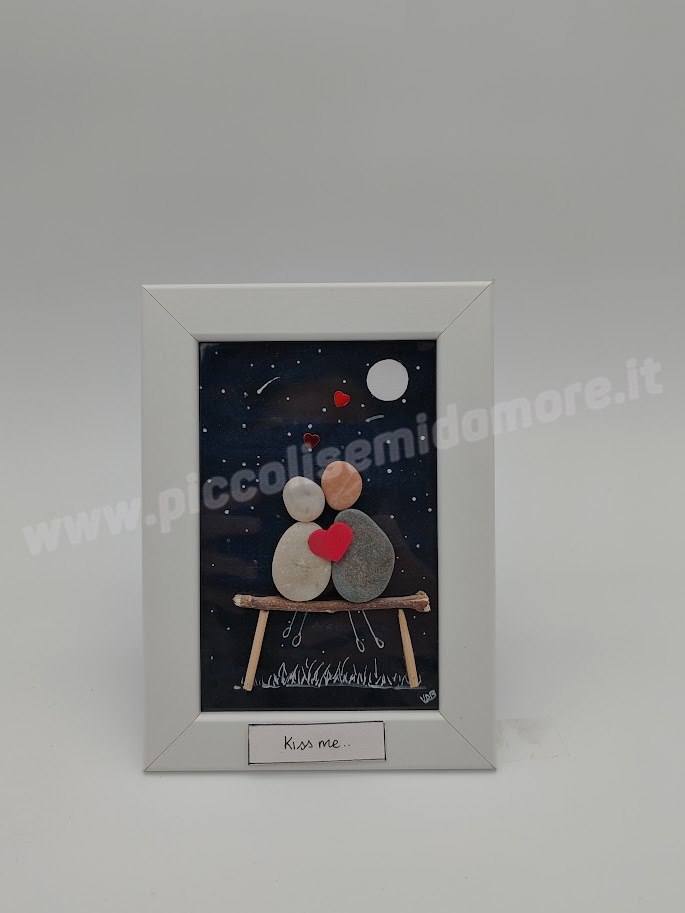 Formato standard 10×15, cornice bianca (materiale plastica). Soggetto su cartoncino acquarellabile gr 250 con possibilità di scrittura al suo interno. Rivestimento esterno del biglietto in plexiglass. Eventuali formati più grandi da concordare con costo aggiuntivo. Per la particolarità ed unicità dei sassi utilizzati, ogni pezzo differisce in piccoli particolari dagli altri e dal prototipo mostrato in foto. Questo rende unico e irripetibile ogni articolo.