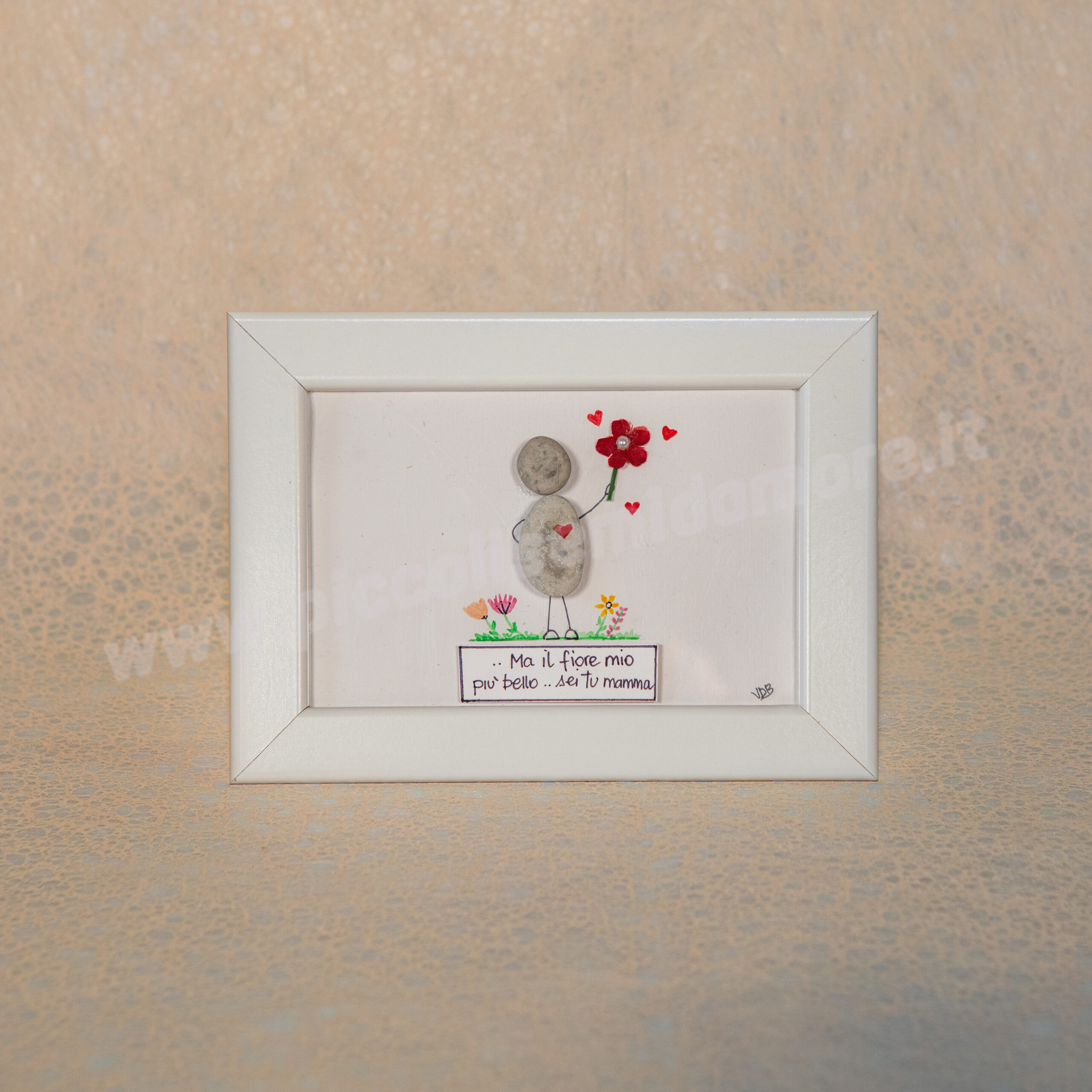 Formato standard 10×15, cornice bianca (materiale plastica). Soggetto su cartoncino acquarellabile gr 250 con possibilità di scrittura al suo interno. Rivestimento esterno del biglietto in plexiglass. Eventuali formati più grandi da concordare con costo aggiuntivo. Per la particolarità ed unicità dei sassi utilizzati, ogni pezzo differisce in piccoli particolari dagli altri e dal prototipo mostrato in foto. Questo rende unico e irripetibile ogni articolo.