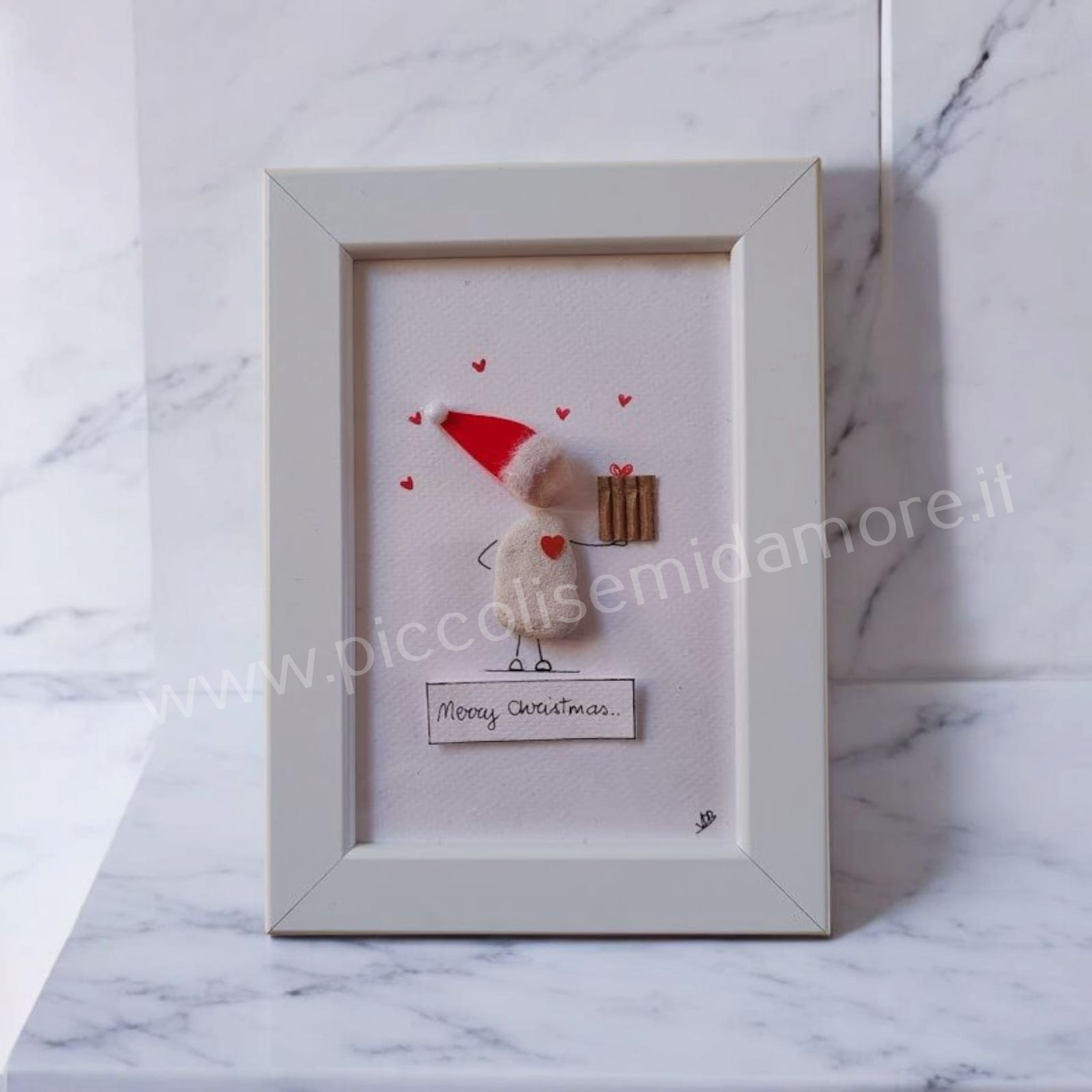 Formato standard 10×15, cornice bianca (materiale plastica). Soggetto su cartoncino acquarellabile gr 250 con possibilità di scrittura al suo interno. Rivestimento esterno del biglietto in plexiglass. Eventuali formati più grandi da concordare con costo aggiuntivo. Per la particolarità ed unicità dei sassi utilizzati, ogni pezzo differisce in piccoli particolari dagli altri e dal prototipo mostrato in foto. Questo rende unico e irripetibile ogni articolo.