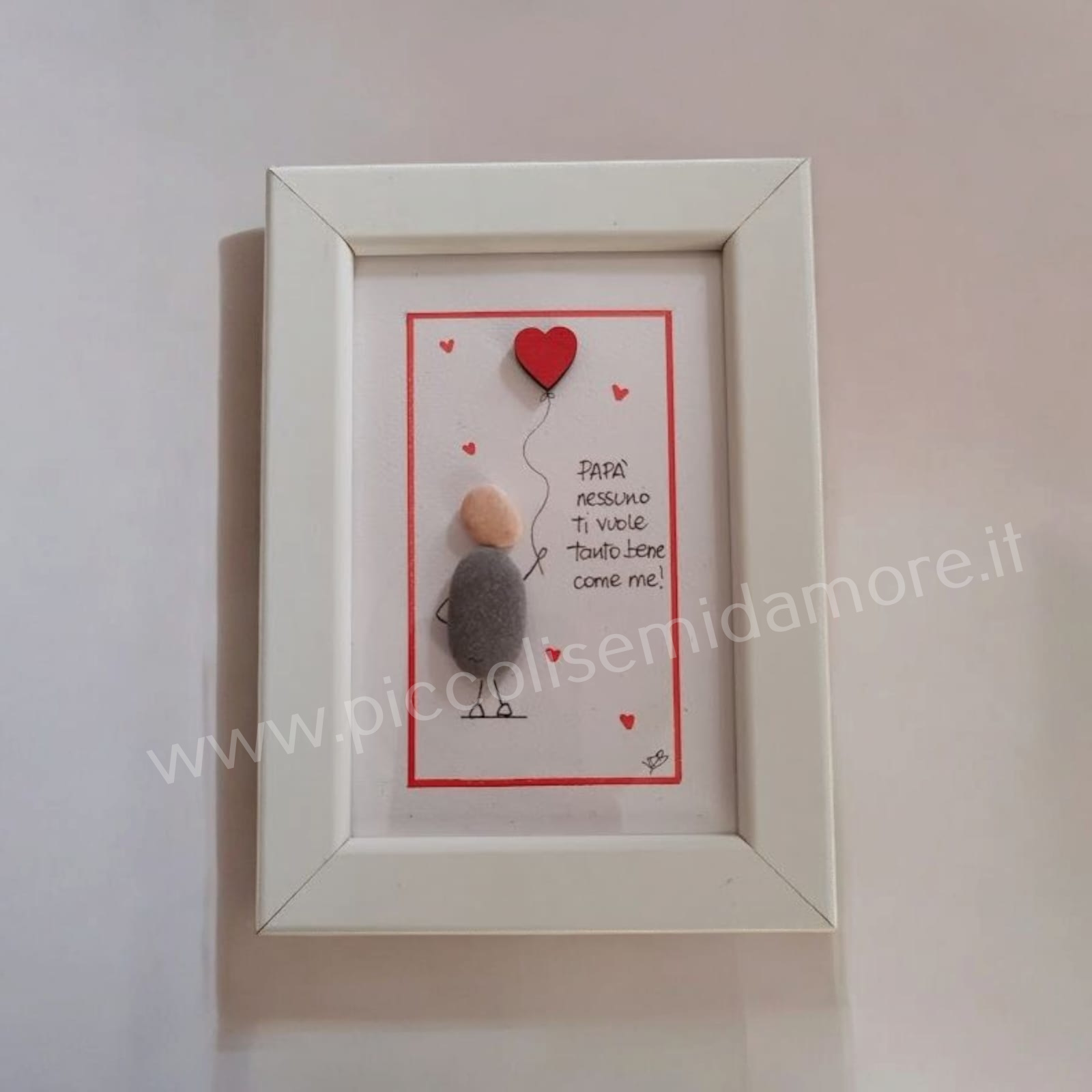 Formato standard 10×15, cornice bianca (materiale plastica). Soggetto su cartoncino acquarellabile gr 250 con possibilità di scrittura al suo interno. Rivestimento esterno del biglietto in plexiglass. Eventuali formati più grandi da concordare con costo aggiuntivo. Per la particolarità ed unicità dei sassi utilizzati, ogni pezzo differisce in piccoli particolari dagli altri e dal prototipo mostrato in foto. Questo rende unico e irripetibile ogni articolo.