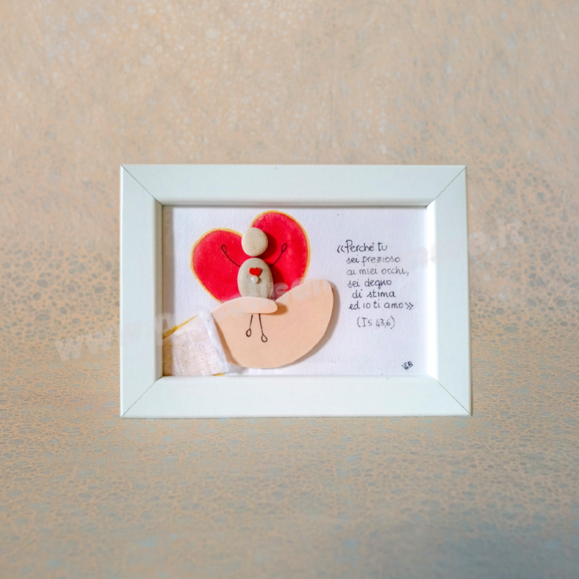 Formato standard 10×15, cornice bianca (materiale plastica). Soggetto su cartoncino acquarellabile gr 250 con possibilità di scrittura al suo interno. Rivestimento esterno del biglietto in plexiglass. Eventuali formati più grandi da concordare con costo aggiuntivo. Per la particolarità ed unicità dei sassi utilizzati, ogni pezzo differisce in piccoli particolari dagli altri e dal prototipo mostrato in foto. Questo rende unico e irripetibile ogni articolo.