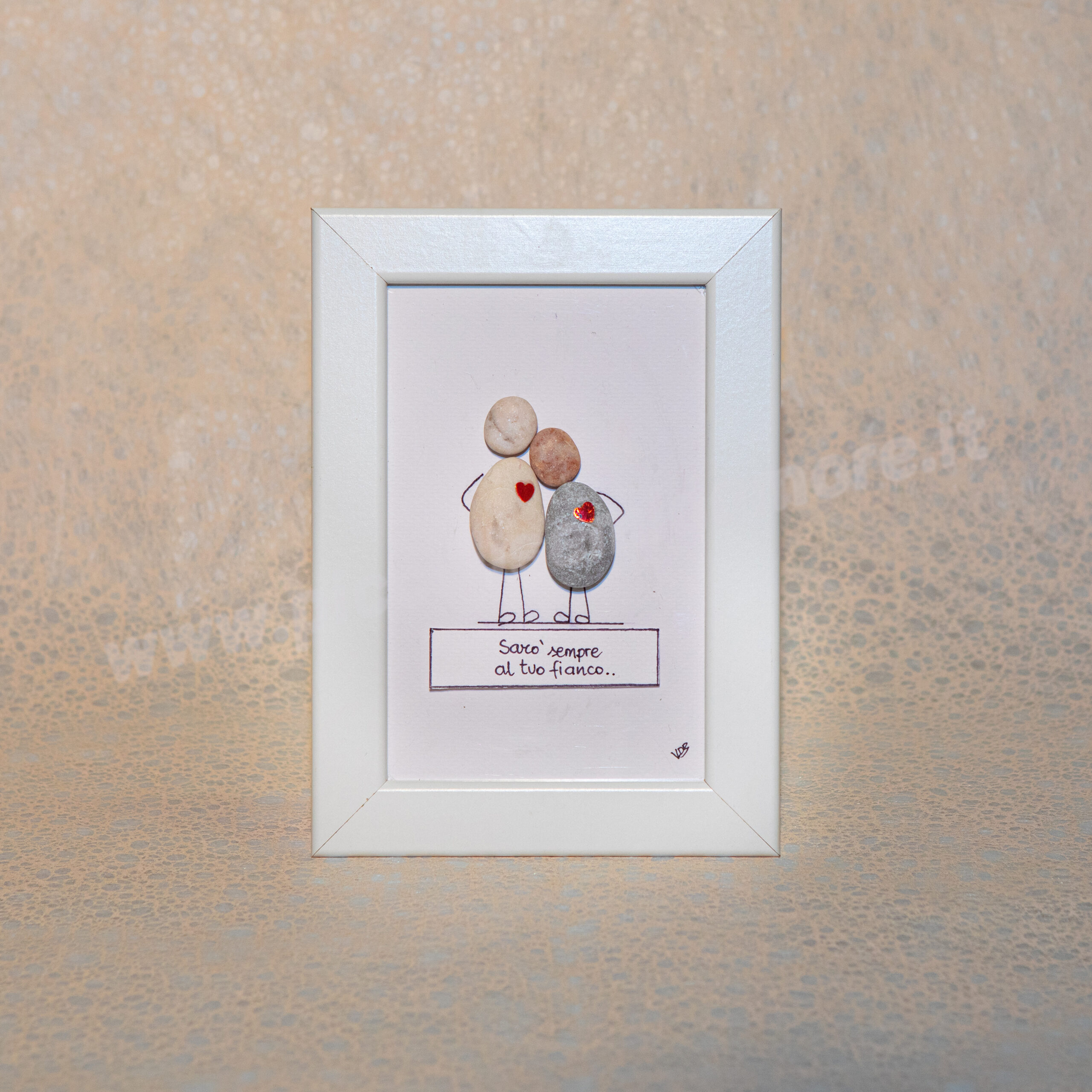 Formato standard 10×15, cornice bianca (materiale plastica). Soggetto su cartoncino acquarellabile gr 250 con possibilità di scrittura al suo interno. Rivestimento esterno del biglietto in plexiglass. Eventuali formati più grandi da concordare con costo aggiuntivo. Per la particolarità ed unicità dei sassi utilizzati, ogni pezzo differisce in piccoli particolari dagli altri e dal prototipo mostrato in foto. Questo rende unico e irripetibile ogni articolo.