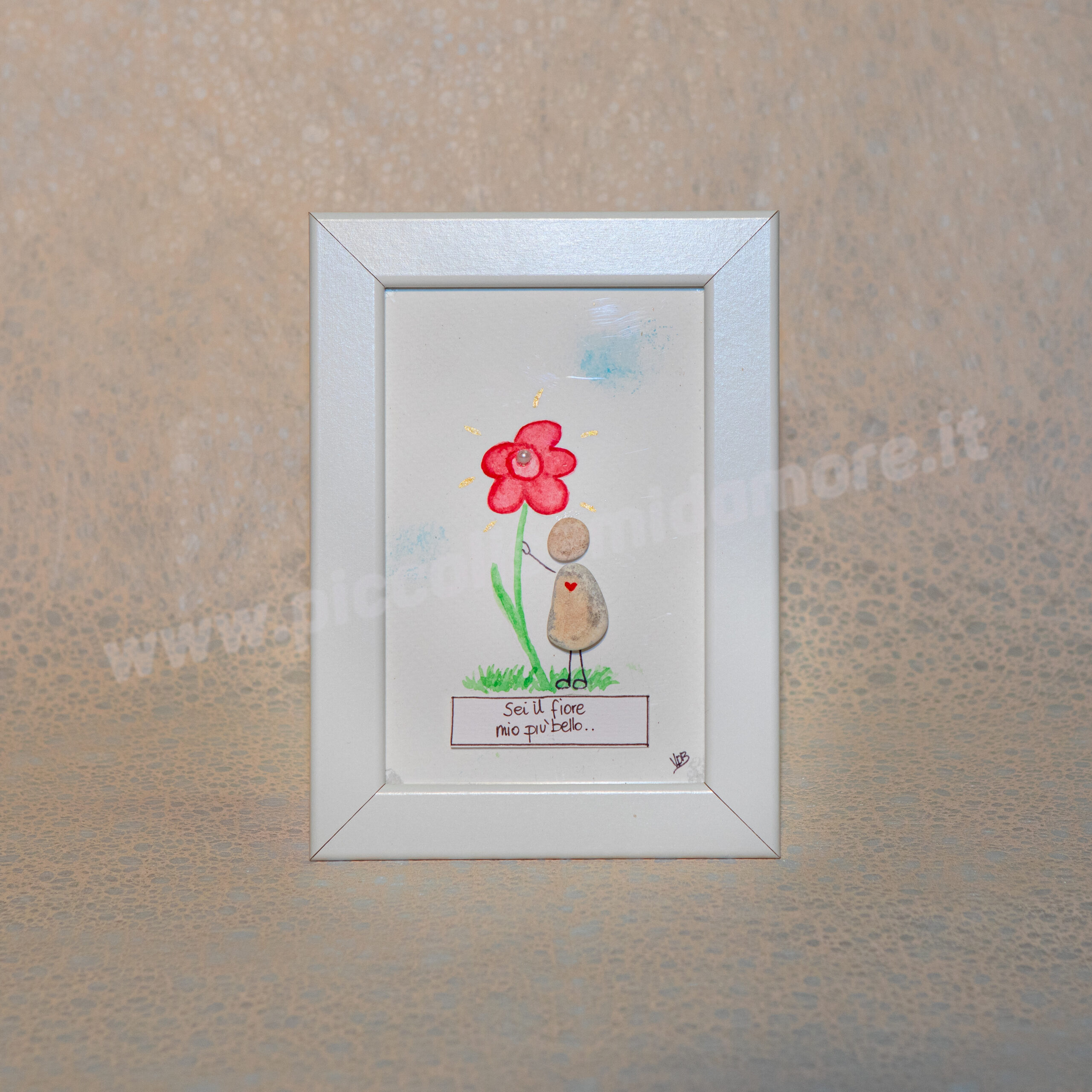 Formato standard 10×15, cornice bianca (materiale plastica). Soggetto su cartoncino acquarellabile gr 250 con possibilità di scrittura al suo interno. Rivestimento esterno del biglietto in plexiglass. Eventuali formati più grandi da concordare con costo aggiuntivo. Per la particolarità ed unicità dei sassi utilizzati, ogni pezzo differisce in piccoli particolari dagli altri e dal prototipo mostrato in foto. Questo rende unico e irripetibile ogni articolo.