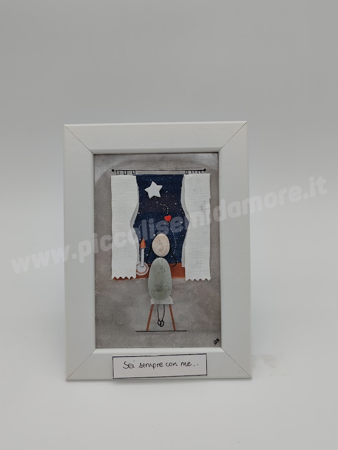 Formato standard 10×15, cornice bianca (materiale plastica). Soggetto su cartoncino acquarellabile gr 250 con possibilità di scrittura al suo interno. Rivestimento esterno del biglietto in plexiglass. Eventuali formati più grandi da concordare con costo aggiuntivo. Per la particolarità ed unicità dei sassi utilizzati, ogni pezzo differisce in piccoli particolari dagli altri e dal prototipo mostrato in foto. Questo rende unico e irripetibile ogni articolo.