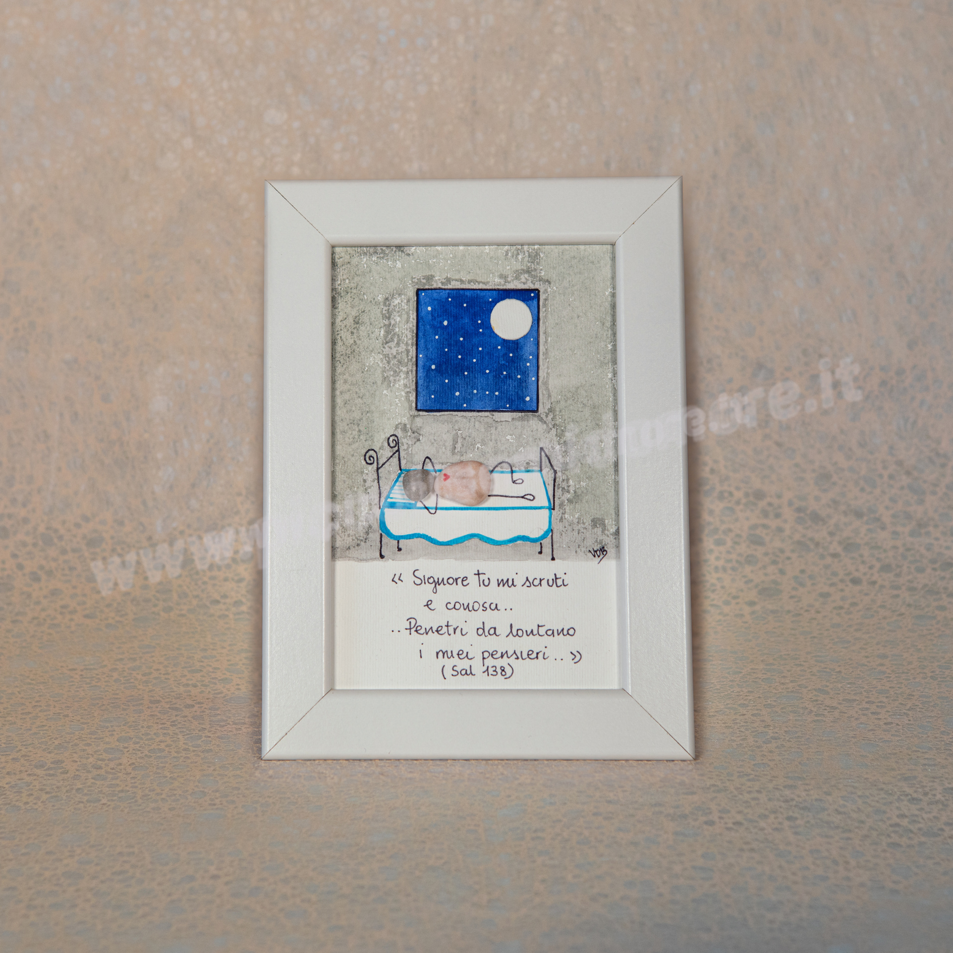 Formato standard 10×15, cornice bianca (materiale plastica). Soggetto su cartoncino acquarellabile gr 250 con possibilità di scrittura al suo interno. Rivestimento esterno del biglietto in plexiglass. Eventuali formati più grandi da concordare con costo aggiuntivo. Per la particolarità ed unicità dei sassi utilizzati, ogni pezzo differisce in piccoli particolari dagli altri e dal prototipo mostrato in foto. Questo rende unico e irripetibile ogni articolo.