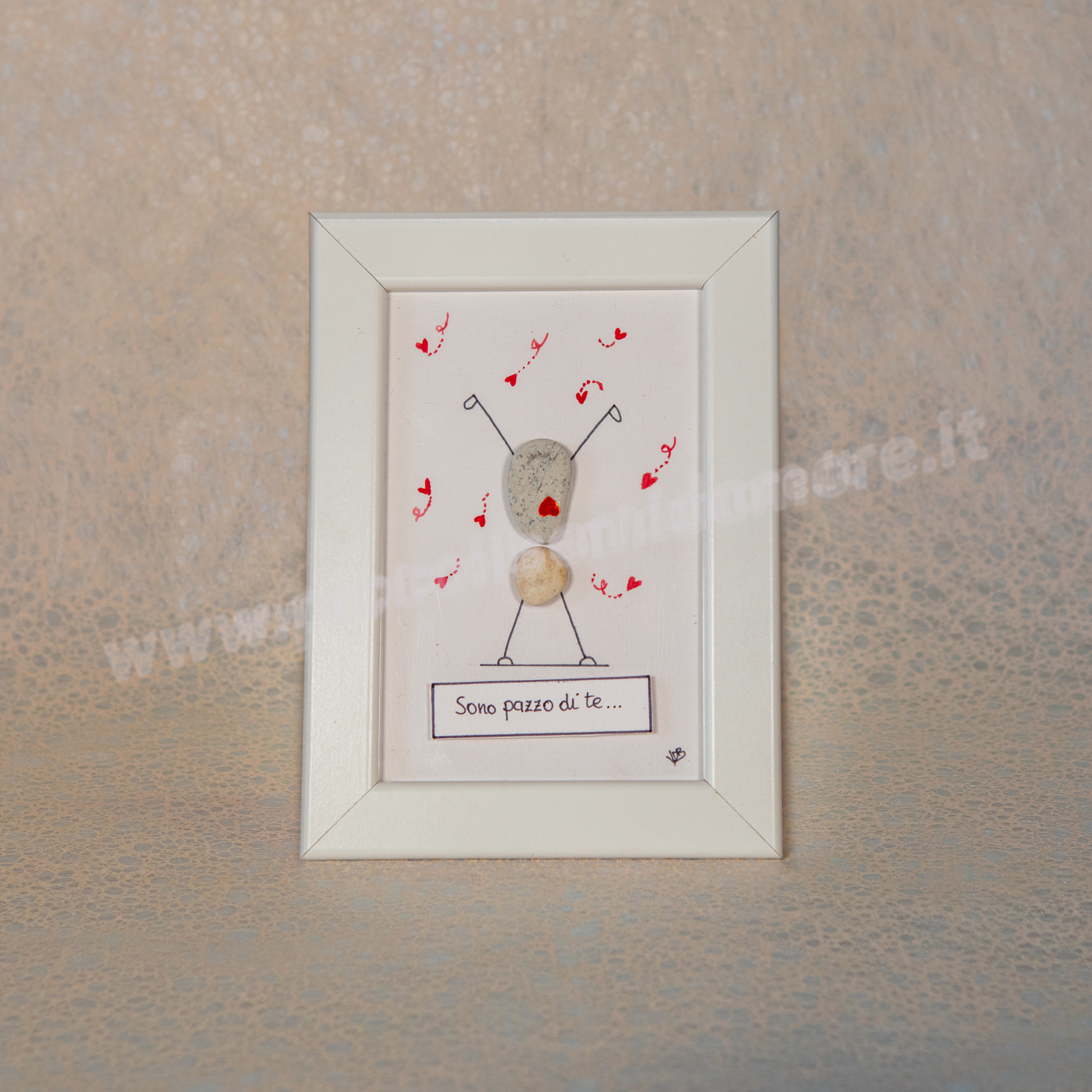 Formato standard 10×15, cornice bianca (materiale plastica). Soggetto su cartoncino acquarellabile gr 250 con possibilità di scrittura al suo interno. Rivestimento esterno del biglietto in plexiglass. Eventuali formati più grandi da concordare con costo aggiuntivo. Per la particolarità ed unicità dei sassi utilizzati, ogni pezzo differisce in piccoli particolari dagli altri e dal prototipo mostrato in foto. Questo rende unico e irripetibile ogni articolo.