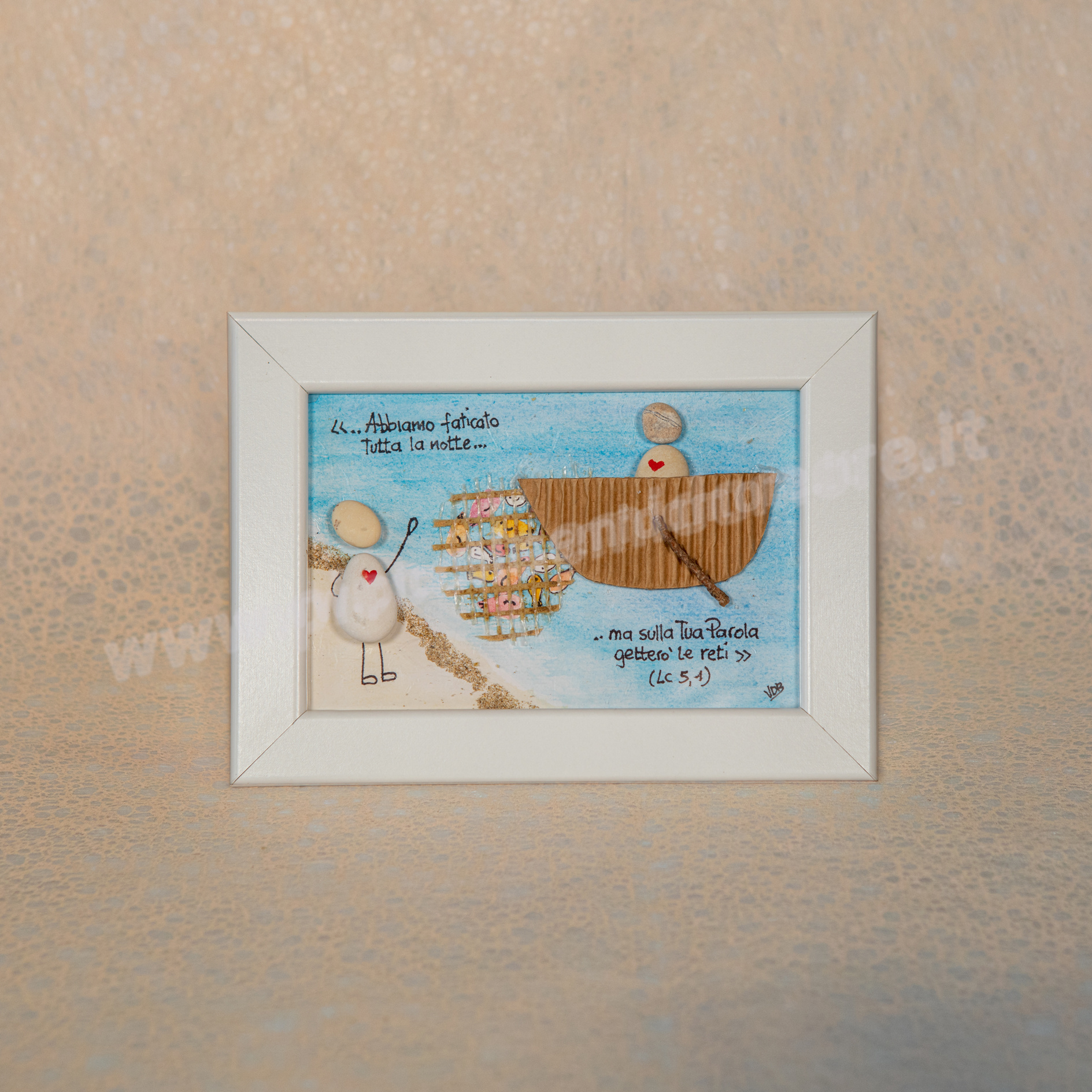 Formato standard 10×15, cornice bianca (materiale plastica). Soggetto su cartoncino acquarellabile gr 250 con possibilità di scrittura al suo interno. Rivestimento esterno del biglietto in plexiglass. Eventuali formati più grandi da concordare con costo aggiuntivo. Per la particolarità ed unicità dei sassi utilizzati, ogni pezzo differisce in piccoli particolari dagli altri e dal prototipo mostrato in foto. Questo rende unico e irripetibile ogni articolo.