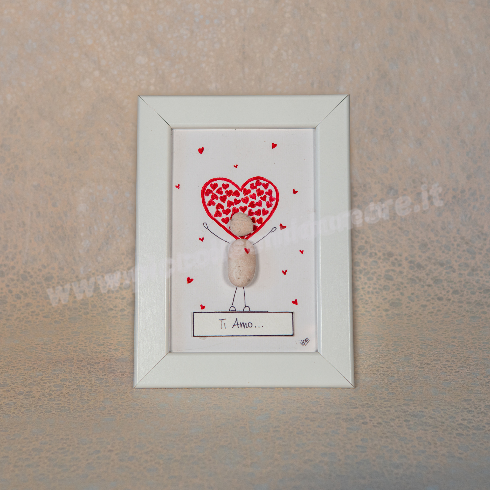 Formato standard 10×15, cornice bianca (materiale plastica). Soggetto su cartoncino acquarellabile gr 250 con possibilità di scrittura al suo interno. Rivestimento esterno del biglietto in plexiglass. Eventuali formati più grandi da concordare con costo aggiuntivo. Per la particolarità ed unicità dei sassi utilizzati, ogni pezzo differisce in piccoli particolari dagli altri e dal prototipo mostrato in foto. Questo rende unico e irripetibile ogni articolo.