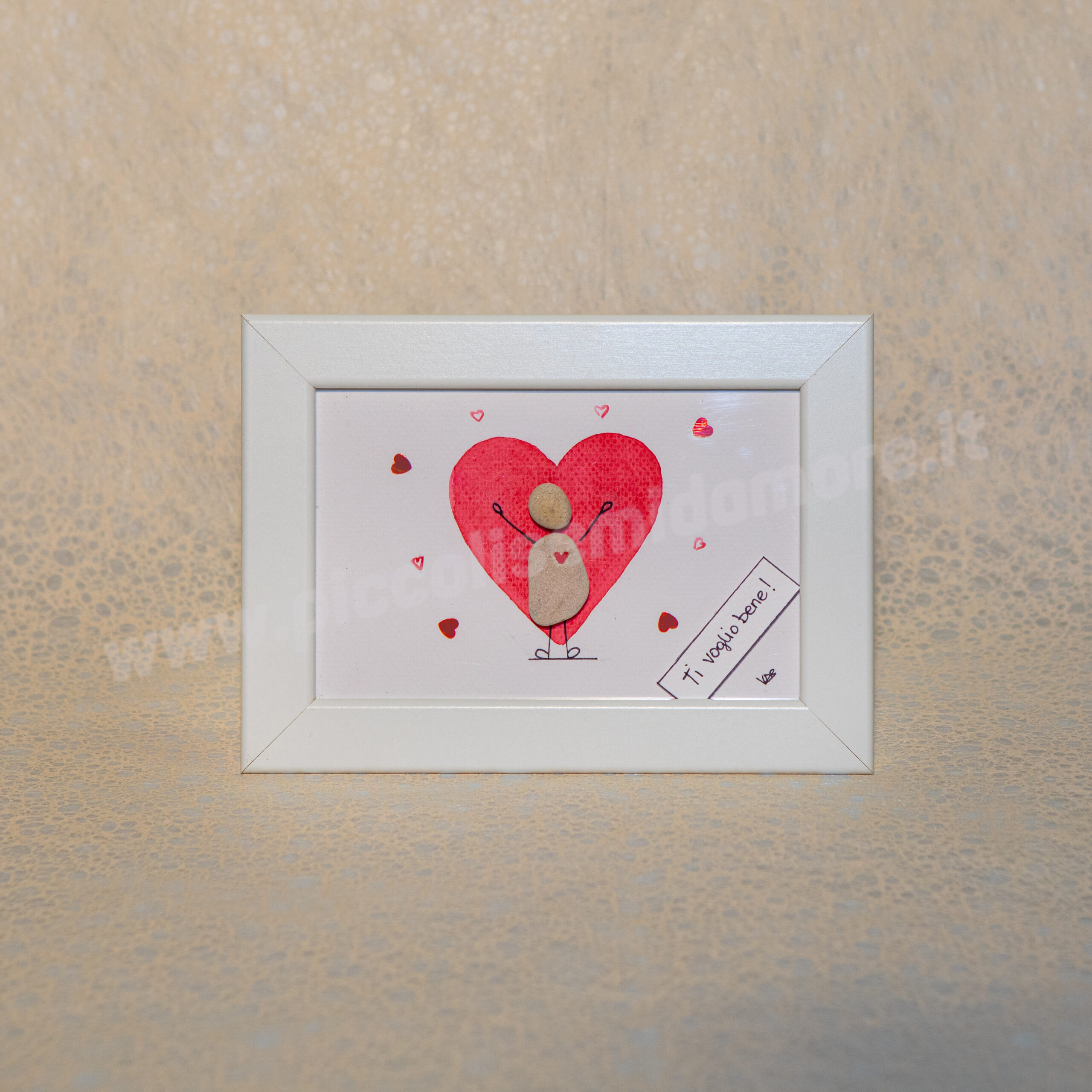 Formato standard 10×15, cornice bianca (materiale plastica). Soggetto su cartoncino acquarellabile gr 250 con possibilità di scrittura al suo interno. Rivestimento esterno del biglietto in plexiglass. Eventuali formati più grandi da concordare con costo aggiuntivo. Per la particolarità ed unicità dei sassi utilizzati, ogni pezzo differisce in piccoli particolari dagli altri e dal prototipo mostrato in foto. Questo rende unico e irripetibile ogni articolo.