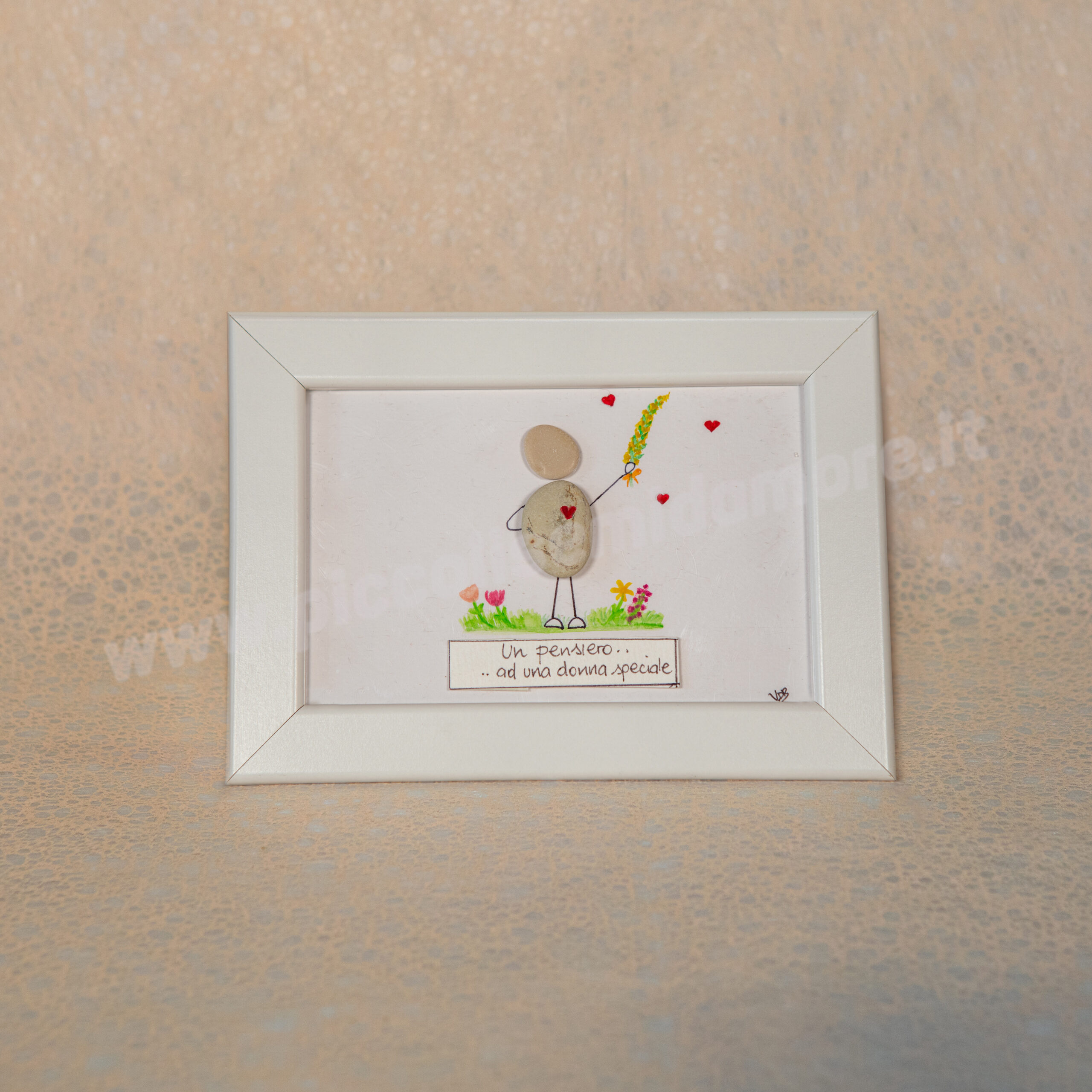 Formato standard 10×15, cornice bianca (materiale plastica). Soggetto su cartoncino acquarellabile gr 250 con possibilità di scrittura al suo interno. Rivestimento esterno del biglietto in plexiglass. Eventuali formati più grandi da concordare con costo aggiuntivo. Per la particolarità ed unicità dei sassi utilizzati, ogni pezzo differisce in piccoli particolari dagli altri e dal prototipo mostrato in foto. Questo rende unico e irripetibile ogni articolo.