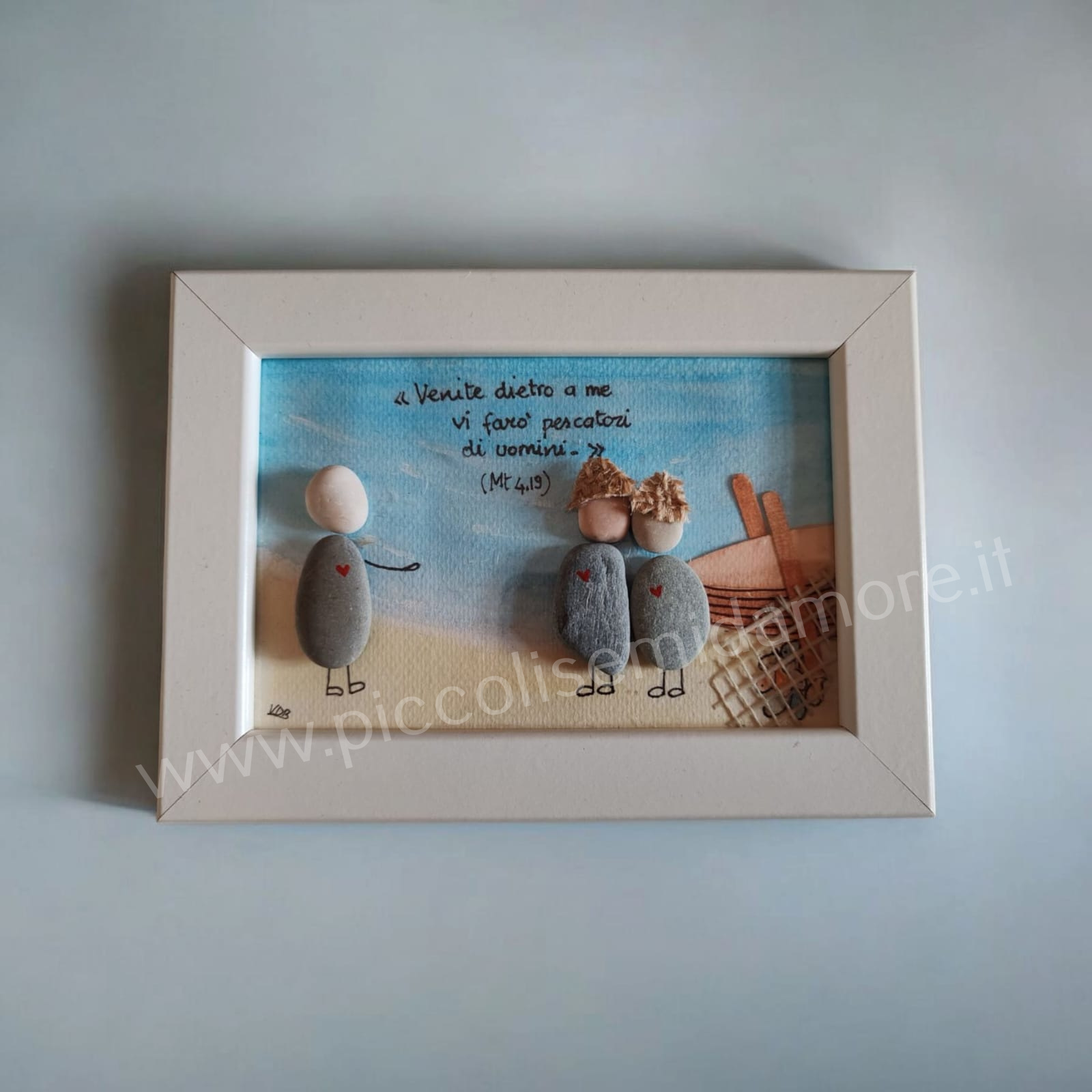 Formato standard 10×15, cornice bianca (materiale plastica). Soggetto su cartoncino acquarellabile gr 250 con possibilità di scrittura al suo interno. Rivestimento esterno del biglietto in plexiglass. Eventuali formati più grandi da concordare con costo aggiuntivo. Per la particolarità ed unicità dei sassi utilizzati, ogni pezzo differisce in piccoli particolari dagli altri e dal prototipo mostrato in foto. Questo rende unico e irripetibile ogni articolo.