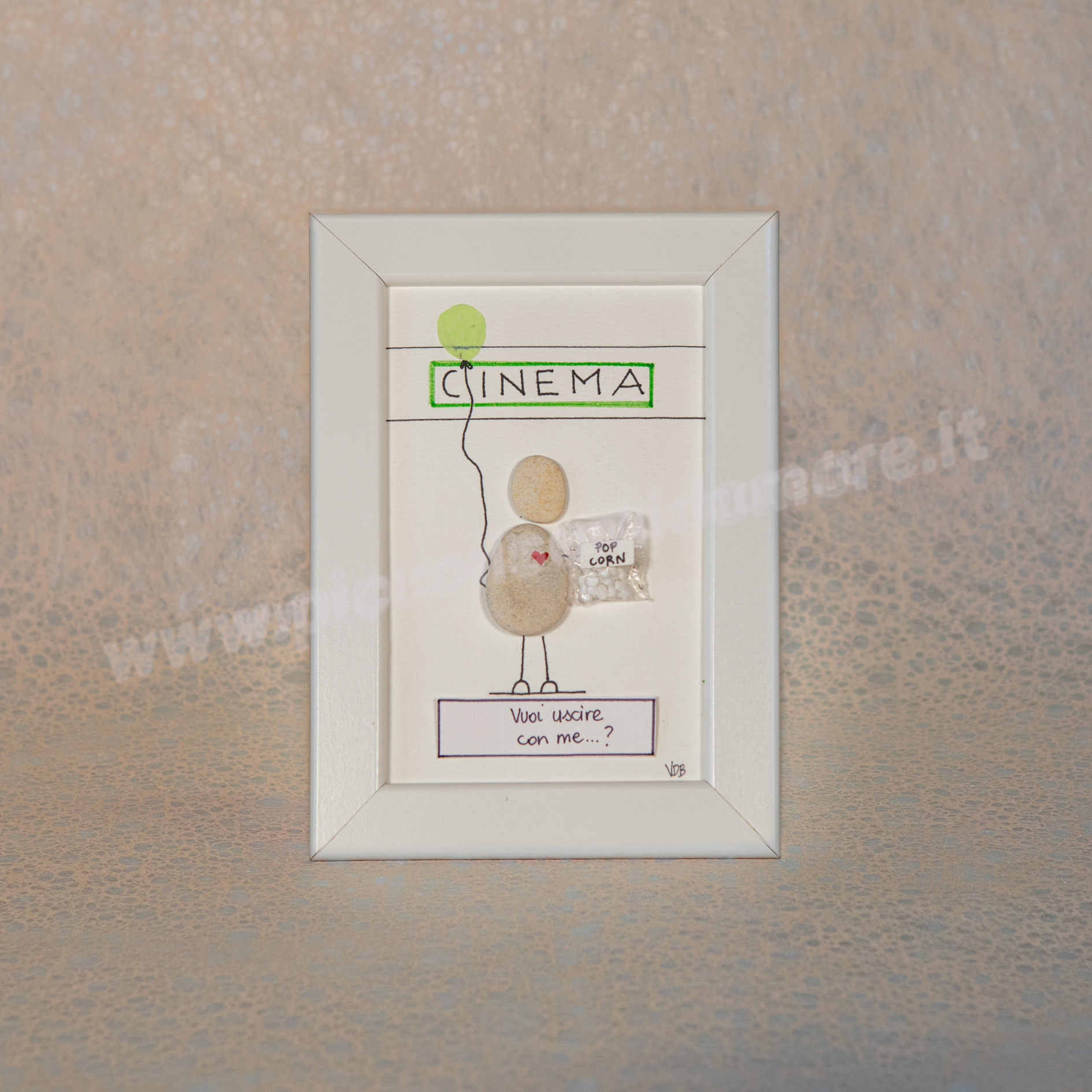 Formato standard 10×15, cornice bianca (materiale plastica). Soggetto su cartoncino acquarellabile gr 250 con possibilità di scrittura al suo interno. Rivestimento esterno del biglietto in plexiglass. Eventuali formati più grandi da concordare con costo aggiuntivo. Per la particolarità ed unicità dei sassi utilizzati, ogni pezzo differisce in piccoli particolari dagli altri e dal prototipo mostrato in foto. Questo rende unico e irripetibile ogni articolo.